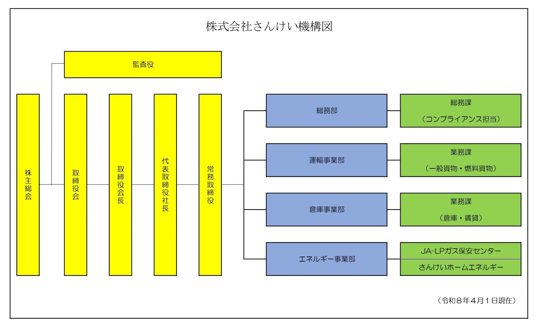 総務部・運輸事業部・倉庫事業部・エネルギー事業部の4部門を右側に集約。